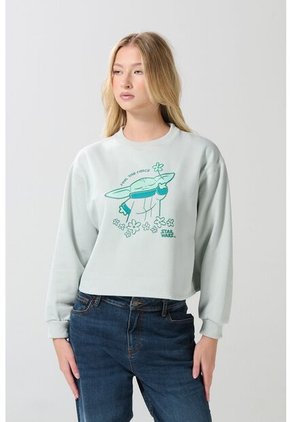 Buzo para mujer crop top verde claro cuenta con diseño de The Mandalorian (Star Wars) en frente, cuello redondo, manga larga, puños en rib y un ajuste ligeramente ceñido al cuerpo. Gracias al estilo versátil de esta prenda podrás complementar tu outfit para ir a estudiar, trabajar o simplemente disfrutar de una salida con tus amigos.