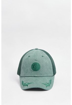 Cachucha trucker para hombre en tono verde cuenta con malla posterior, diseño bordado en frente y visera curva. Luce radiante en los días soleados combinando este accesorio con una camiseta oversize y una bermuda en jean, así crearás un atuendo con el que siempre marcarás la diferencia.