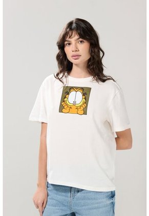 Camiseta crema clara cuello redondo para mujer cuenta con hombro rodado, manga corta, estampado de Garfield localizado en frente y un fit sutilmente holgado en el cuerpo. Perfecta para cualquier día (incluso los lunes), podrás combinarla con una falda de jean, así impactarás a los demás con tu estilo.