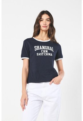 Camiseta para mujer manga corta, en algodón, unicolor con cuello redondo en rib en color contraste y puños en rib en color contraste, con estampado en frente estilo College. Vive tu día a día con un espíritu universitario.