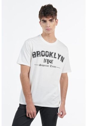 Camiseta crema clara para hombre cuenta con manga corta, diseño college de Brooklyn estampado en frente, cuello redondo y un fit ligeramente ajustado. Gracias a su estilo juvenil y versátil esta prenda será ideal para ti, combínala con tu mejor jean Koaj y crea un total look perfecto para cualquier día de la semana.