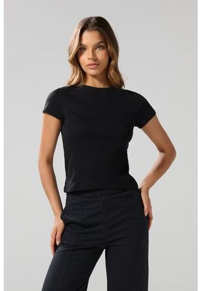 Camiseta negra para mujer, confeccionada en tela de algodón, cuenta con finas texturas de canal, cuello redondo, manga corta y una horma ajustada al cuerpo. Refleja la mejor versión de ti luciendo esta prenda con un jean o una falda en tu próxima salida con amigas. ¡Serás la sensación!