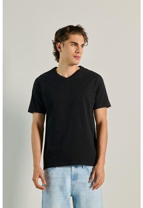 Camiseta unicolor con cuello V para hombre, elaborada en una suave tela de algodón, cuenta con hombro caído, manga corta y una silueta amplia con la que te sentirás cómodo. ¿Buscas una prenda que refleje tu estilo urbano? ¡Esta es la indicada! Combínala con un jean slim con rotos y crea un atuendo con el que te identifiques.