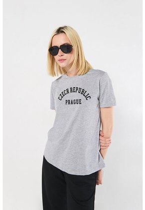 Camiseta para mujer manga corta, unicolor, en algodón, cuello redondo, hombro rodado, silueta holgada, con estampado en frente estilo College, Vive tu día a día con un espíritu universitario.