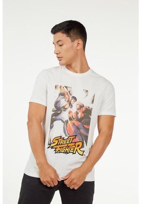 Camiseta para hombre manga corta crema claro, elaborada en poliéster y algodón, tiene un diseño de Street Fighter estampado en frente, cuello redondo y una horma ajustada al torso. Esta es una prenda 100% moderna que podrás combinar con tu mejor jean y lucir para disfrutar de una maratón de videojue