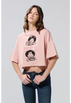 Camiseta crop top rosada clara para mujer cuenta con hombro caído, cuello redondo, manga larga, diseño de Mafalda localizado en frente y una silueta oversize en el cuerpo. Opta por crear un look juvenil combinándola con un jean push up y un par de tenis planos. ¡Lucirás fenomenal!