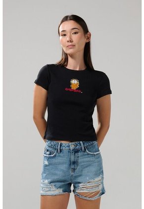 Camiseta negra cuello redondo para mujer, confeccionada en tela con texturas acanaladas, cuenta con manga corta, diseño de Garfield localizado en frente y una silueta ceñida al cuerpo. ¡Luce encantadora con esta prenda! Combínala con tu mejor jean y llévala para salir de compras con tus amigas.