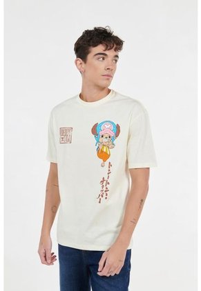 Camiseta hombro rodado, crema, manga corta para hombre, tiene cuello redondo, con estampado en frente de One Piece. Dale un estilo diferente a tu vida y combina esta prenda en tus días casuales.