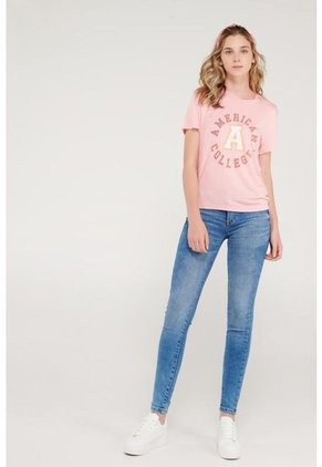 Camiseta para mujer, en tela de cuerpo unicolor, estampado frontal en contraste, cuello redondo y manga corta.