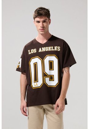 Camiseta cuello V café oscura para hombre cuenta con diseños college localizados, detalle con corte delantero, hombro caído, manga corta y una silueta oversize en el cuerpo. Ideal para lucir con jeans o bermudas, será el complemento que necesitas para sentirte cómodo en tus planes diarios o casuales.