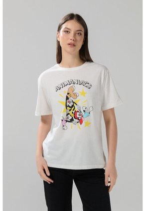 Camiseta manga corta crema clara para mujer cuenta con hombro rodado, estampado en frente de Animaniacs, cuello redondo y un fit ligeramente holgado al cuerpo. Renueva tu guardarropa con esta prenda, será la opción perfecta para lucir con tus jeans favoritos en tu próxima salida con amigos.