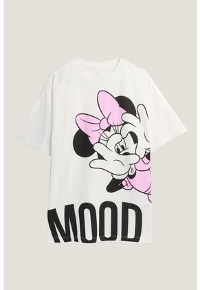Camiseta crema clara manga corta para mujer, elaborada en algodón 100% y con un fit oversize, cuenta con hombro rodado, diseño de Minnie (Disney) en frente y cuello redondo. Esta es una prenda cómoda y juvenil que podrás lucir con tus jeans ajustados favoritos, así serás la sensación en todos tus planes.