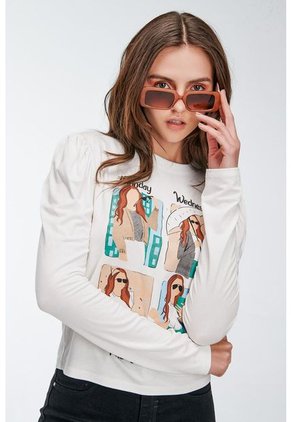 Camiseta para mujer cuello redondo, con recogido sobre hombros para generar volumen; estampado sobre el frente y manga larga.