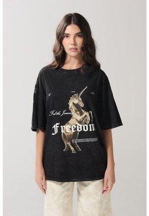 Camiseta para mujer manga corta gris intensa con proceso de teñido cuenta con hombro caído, cuello redondo, diseño mitológico en frente y una silueta oversize en el cuerpo. ¡Esta prenda resaltará todo tu estilo urbano! Con un jean ancho y un par de tenis planos crearás una combinación que amarás.