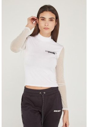Blusa para mujer, en tela de cuerpo unicolor, con cuello al tono, mensaje frontal, y mangas semi transparentes.