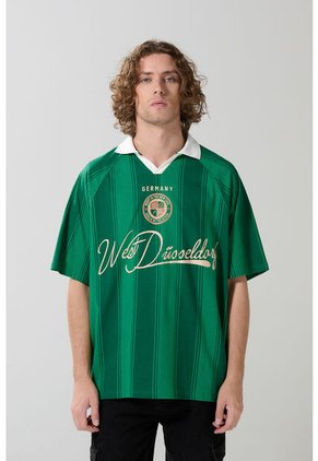Camiseta para hombre en tono verde oscura cuenta con cuello polo en contraste con abertura V, manga ranglan corta, diseño college en frente y un fit oversize en el cuerpo. ¡Nada más urbano que esta prenda! Combínala con un jean cargo y un par de tenis planos, así crearás un total look con el que te destacarás.
