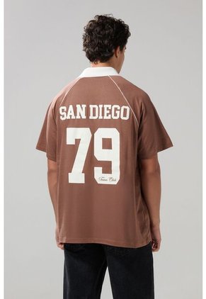 Camiseta café medio para hombre cuenta con diseños college en frente y espalda, cuello polo, manga ranglan corta y una silueta oversize en el cuerpo. Esta prenda tiene un estilo moderno que podrás combinar con tus jeans preferidos y lucir en todos tus planes descomplicados con amigos.