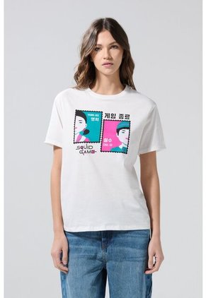 Camiseta cuello redondo para mujer en tono crema clara, elaborada en tela de algodón, cuenta con hombro rodado, manga corta, diseño de Squid Game en frente y un fit ligeramente holgado. ¡Esta prenda será tu opción favorita! Con una falda en jean crearás un outfit ideal para los días soleados.