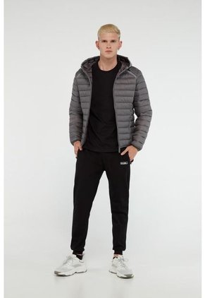 Chaqueta para hombre acolchada, con capota y cortes en tela reflectiva, cuerpo unicolor, bolsillos y cierre en cremallera.