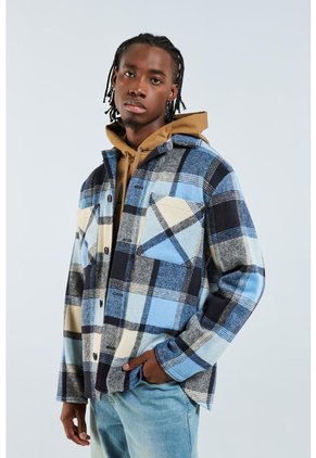 Chaqueta tipo trucker para hombre en tono azul a cuadros, bolsillos de parche con tapa y una horma amplia al cuerpo. Viste esta prenda para estar cómodo en tus salidas casuales.