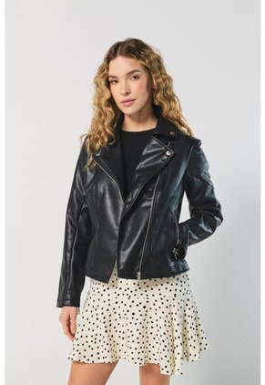Chaqueta para mujer en tono unicolor, elaborada en tela con efecto de piel, cuenta con cierre cruzado con cremallera en frente, solapas en el cuello, 2 bolsillos y una silueta ajustada. Esta prenda es el complemento que tu outfit pide a gritos, combínala con tus atuendos casuales y marca la diferencia con tu propio estilo.
