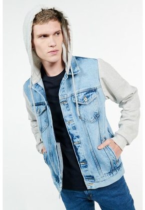 Chaqueta de jean para hombre, fit slim, en denim, con capota y mangas en otra tela, con bolsillos de parche y procesos de lavado con reservas.