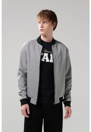 Chaqueta gris medio bomber para hombre cuenta con cuello, ruedo y puños con contrastes negros, cierre delantero con cremallera, 2 bolsillos laterales y una silueta ajustada al cuerpo. ¿No decides qué ponerte para salir de casa? Esta prenda, combinada con un jean skinny, serán la opción ideal para tu look.
