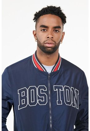 Chaqueta bomber azul oscura para hombre cuenta con una elaboración en poliéster, cuello, puños y pretina tejidos en rib, cierre delantero con cremallera, 2 bolsillos laterales con broche, un estampado de letras en frente y una horma ajustada al cuerpo. ¿El día está frío? Esta prenda te mantendrá abr