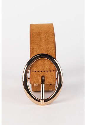 Cinturón para mujer en tono café claro, elaborado en material sintético, cuenta con taches metálicos decorativos y hebilla ovalada dorada. Crea un look hecho a tu medida combinando este accesorio con tus jeans o vestidos favoritos, así impactarás a los demás con tu propio estilo.