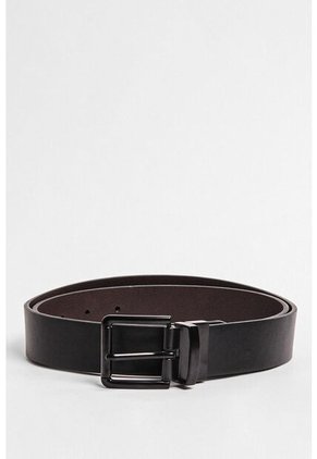 Cinturón para hombre en tono negro cuenta con parte reversible café, textura lisa y hebilla cuadrada metálica con trabilla incorporada. Perfecto para tus looks casuales o formales, podrás lucirlo con tus pantalones en dril preferidos y crear atuendos hechos a tu medida. MEDIDAS:Talla Cinturon 90cm, 95cm, 100cm, 105cm, La medida se toma desde el inicio de la hebilla hasta la 3 perforacion.