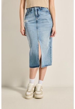 Falda en jean larga azul clara para mujer cuenta con abertura delantera, 5 bolsillos, tiro alto, roto en frente, desgastes sutiles de color y un fit ligeramente ajustado al cuerpo. Crea un outfit encantador combinando esta prenda con una camiseta crop top y tus tenis preferidos, así te destacarás en todos tus planes.