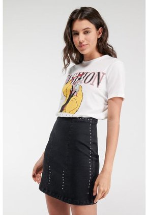 Falda corta tiro alto para mujer, negra, con pedrería.