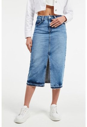 Falda en jean de silueta larga para mujer en tono azul clara tiene detalle con deshilado en el borde inferior, 5 bolsillos, abertura en frente, tiro alto y un fit sutilmente ajustado al cuerpo. Plasma tu espíritu femenino con esta prenda, combínala con una blusa manga corta y crea un estilo con el que te robes todas las miradas.