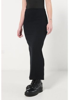 Falda larga negra para mujer, elaborada en tela viscosa, cuenta con tiro alto, cintura ancha y un fit ajustado al cuerpo. Crea un atuendo minimalista combinándola con una blusa blanca y tus botines favoritos, así lucirás encantadora en tus planes casuales o fechas especiales.