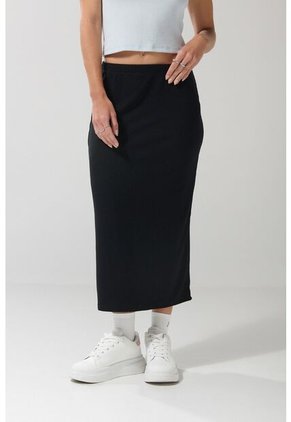 Falda larga negra para mujer cuenta con abertura posterior, detalle con cintura elástica y una silueta ajustada al cuerpo. Crea un outfit fiel a tu estilo combinando esta prenda con tus camisetas o blusas KOAJ favoritas. ¡Marcarás la diferencia en todo momento!