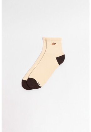 Medias kakis claras cortas para mujer cuentan con contrastes en el talón y la puntera, diseño de pez bordado, elástico en el borde superior y detalles con finas texturas acanaladas. ¡Dales a tus pies la comodidad que tanto se merecen! Combínalas con un par de tenis de plataforma y camina con un estilo único.