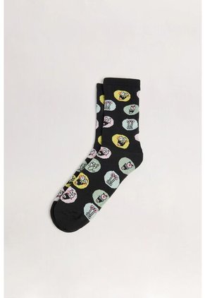 Medias negras largas para hombre cuentan con diseños de los personajes de Bob Esponja, texturas finas acanaladas y elástico en el borde superior. Ideales para caminar o disfrutar de los planes diarios, podrás combinarlas con tus tenis Koaj favoritos y lucir cómodo en todo momento. ¡Tus pies las amarán!