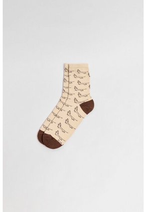 Medias largas kakis claras para hombre cuentan con diseños continuos de perritos, contrastes en la puntera y el talón, finas texturas de canal y elástico en el borde superior. Este complemento te acompañará en todos tus planes cotidianos y te brindará una sensación incomparable de comodidad en tus pies.