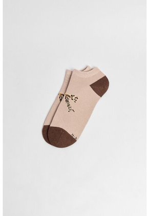 Medias tobilleras kakis oscuras para mujer cuentan con contrastes en la punta y el talón, diseño de moño en animal print en frente y elástico en el borde superior. Combínalas con un par de tenis de plataforma, complementa tus looks casuales y siéntete cómoda en cada paso que des.