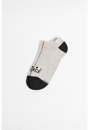 Medias grises claras tobilleras para hombre cuentan con contrastes en la puntera y el talón, diseño college localizado, finas texturas acanaladas y elástico en el borde superior. Perfectas para los planes diarios, podrás combinarlas con un par de tenis casuales y sentirte cómodo al caminar.