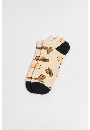 Medias tobilleras kakis claras para hombre cuentan con contrastes negros en el talón y la punta, diseños de Woody (Toy Story, Disney), finas texturas acanaladas y elástico en el borde superior. Dales un toque divertido a tus pies combinándolas con tus tenis KOAJ favoritos, serán perfectas para caminar con mucha comodidad.