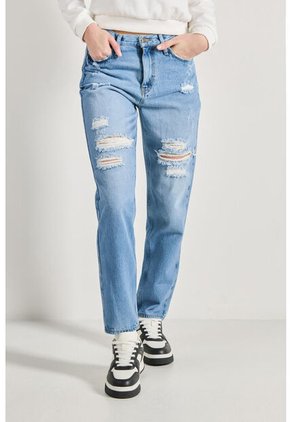 Jean boyfriend azul claro para mujer cuenta con tiro alto, bota recta, 5 bolsillos, detalles con rotos en frente, desgastes sutiles de color y un fit ligeramente holgado en el cuerpo. Encuentra una nueva forma de proyectarte al mundo con esta prenda, combínala con una camiseta tie dye y luce juvenil en tus planes más descomplicados.