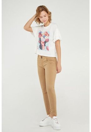Pantalones para mujer, en tela de cuerpo unicolor, con tiro medio, push up fit, y 5 bolsillos.