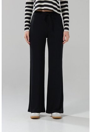 Pantalón flare negro para mujer cuenta con tiro alto, cordón en la cintura para anudar, diseño de bota ancha y una silueta holgada en el cuerpo. Perfecto para las salidas diarias, podrás combinarlo con tu mejor blusa básica y destacarte con tu look. ¡Serás el centro de todas las miradas!