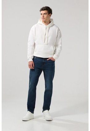 Jean straight leg para hombre en tono azul oscuro cuenta con ligeros desgastes localizados, bota recta, pretina con botón metálico, 5 bolsillos funcionales y un ajuste holgado en el cuerpo. Crea atuendos clásicos combinando esta prenda con tus camisetas básicas favoritas. ¡Lucirás en tendencia!