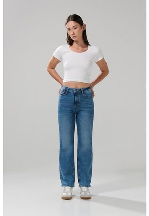 Jean straight leg azul medio para mujer cuenta con 5 bolsillos, tiro alto, bota recta, ligeros desgastes localizados, pretina con botón metálico y un fit ligeramente holgado al cuerpo. Casual y versátil, así te destacarás en todo momento, combínalo con una blusa estampada y crea un look inspirador con el que te identifiques.