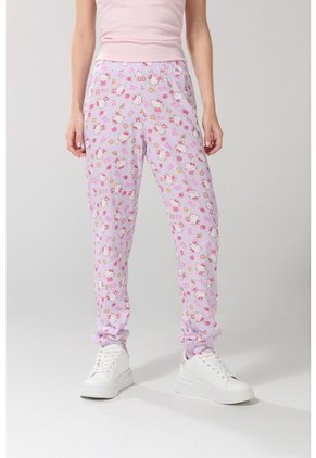 Pantalón para mujer tipo jogger lila claro cuenta con cintura elástica, diseños continuos de Hello Kitty, bota recta y un fit ligeramente ajustado en el cuerpo. Esta prenda, combinada con una camiseta manga sisa y un par de tenis altos, harán un match perfecto en tu total look. ¡Te verás espectacular!