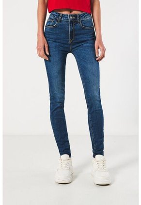 Jean push up para mujer en tono azul oscuro cuenta con 5 bolsillos, realce posterior, detalles con costuras visibles en contraste, pretina con botón metálico y una silueta ceñida al cuerpo. Luce a la moda todos los días combinando esta prenda con blusas o camisetas crop top. ¡Serás la sensación con tu look!