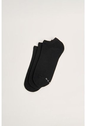 Paquete X3 de medias tobilleras para mujer en tonos negras cuentan con finas texturas de canal, detalle con costura en frente y elástico en el borde superior. Para los días de largas caminatas este complemento, con un par de tenis de plataforma, serán la mejor opción para tus pies. ¡No vas a querer quitártelas!