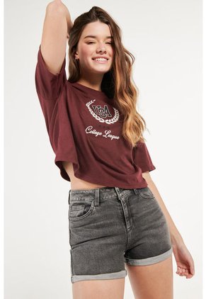 Short en jean para mujer, elaborado con un lavado gris oscuro y en una tela de algodón, tiene detalles con doblez en bordes inferiores, 5 bolsillos, tiro alto y un fit ajustado que realzará la silueta de tus piernas. Esta prenda es perfecta para lucir en un día soleado con una camiseta manga sisa. ¡Crearás un look con el que brillarás en todo momento y lugar!